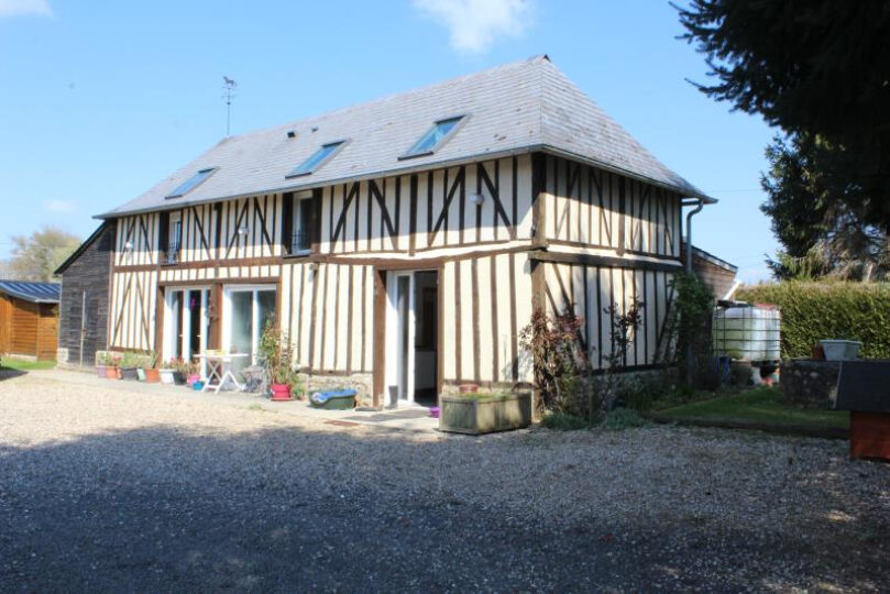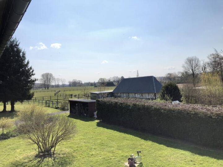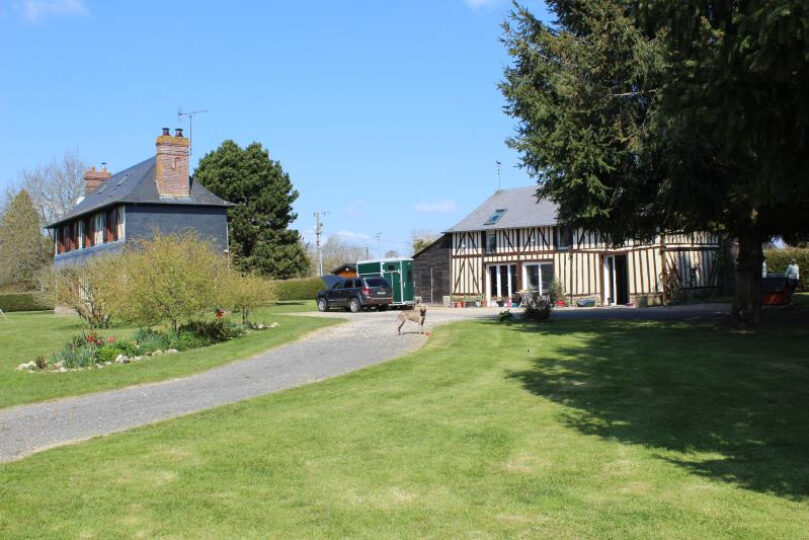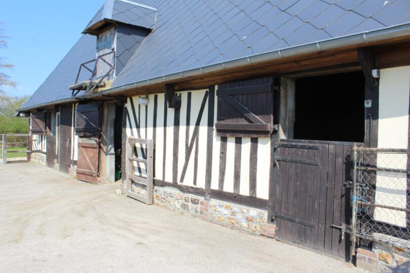 Propriété équestre ! A 1.5kms des commerces et écoles et située dans une paisible impasse, bel ensemble normand composé :~-d’une ravissante maison principale entièrement restaurée qui se compose d’une cuisine aménagée et équipée avec espace repas de 22m2, d’une salle-séjour de 27m2 avec cheminée, de 3 chambres au 1er étage, d’une salle d’eau avec wc, d’un dortoir au 2e étage.~-d’une maison d’amis restaurée de 80m2 également qui comprend un séjour, une cuisine aménagée et équipée, 2 chambres, une sdd, une sdb et un wc.~-d’un hangar à foin~-de 4 abris pour chevaux, 3 boxes 3x4m, 3 paddocks~-3 patures sur 3ha450.~Nous aimons : son environnement agréable et sans vis-à-vis, les aménagements pour équidés, le charme de la maison, la maison d’amis.~Prix : 472 500€ HAI dont 450 000 hors honoraires d’agence et 5% d’honoraires d’agence à charge acquéreur.~~Les informations sur les risques auxquels ce bien est exposé sont disponibles sur le site Géorisques.~www.georisques.gouv.fr